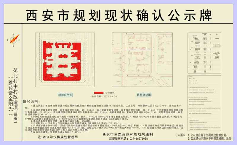 现将西安市规划现状确认公示牌(范北村中村改造项目DK1雅荷紫金阳光处遗项目)公示。