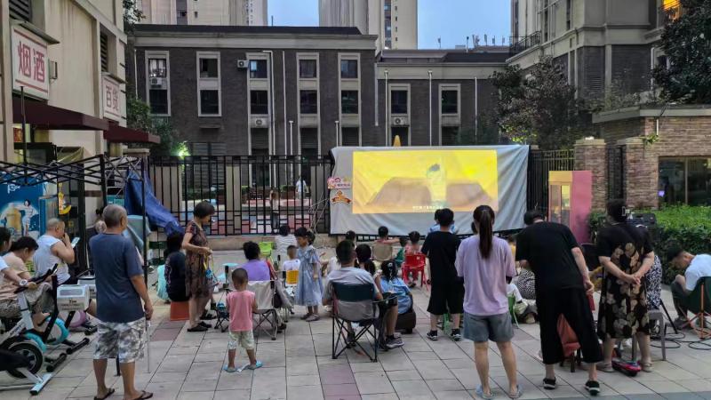 电影开始前,针对老年人进行了药品使用安全的宣传,提醒老人们夏季用药注意事项。电影开始后,孩子们沉浸其中,也有散步路过的居民驻足观影…
