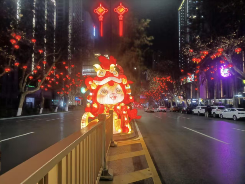 在景家十字东南角,“蛇小巳”仿佛从漫画中走出来一样,在“2025”的光晕下袅袅婷婷送来祝福,高低错落的灯笼为正月十五的到来再添喜庆。