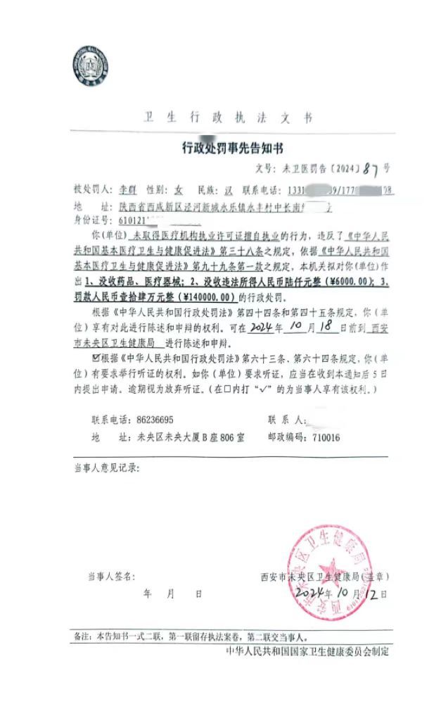 2024年7月4日,接市民投诉反映李群涉嫌非法开展医疗美容执业活动。2024年7月5日,西安市未央区卫生健康局执法人员前往陕西省西安市未央区汇通太古城天后花园5号楼1单元1102室进行监督检查。经查,李群未取得医疗机构执业许可证擅自执业,其行为违反了《中华人民共和国基本医疗卫生与健康促进法》第三十八条之规定,依据《中华人民共和国基本医疗卫生与健康促进法》第九十九条第一款之规定,根据《陕西省卫生健康行政处罚自由裁量权实施标准》第84号的规定,违法类型属于“一般”,西安市未央区卫生健康局对李群拟作出:1、没收药品、医疗器械;2、没收违法所得人民币陆仟元整(¥6000.00);3、罚款人民币壹拾肆万元整(¥140000.00)的行政处罚。