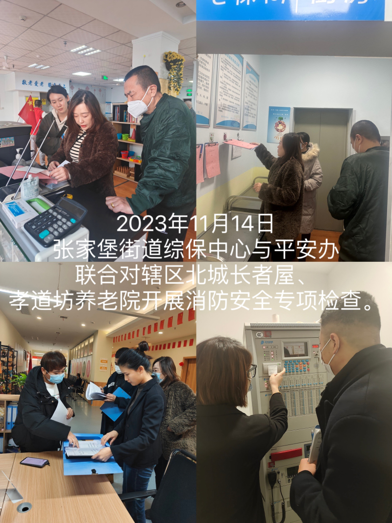 2023年11月14日,张家堡街道综合保障中心与社会治理和平安建设办公室联合对辖区北城长者屋、孝道坊养老院开展消防安全专项检查。