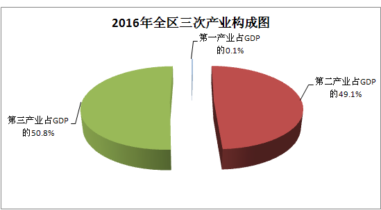 初步测算,2016年全区实现地区生产总值(GDP)772.88亿元,同比增长8.7%①。其中,第一产业增加值1.06亿元,下降4.8%②;第二产业增加值379.68亿元,增长10.8%③;第三产业增加值392.14亿元,增长6.7%④。全区三次产业比重为0.1:49.1:50.8。非公有制经济完成增加值415.16亿元,占地区生产总值的比重为53.7%。2015年全区单位GDP能耗0.539吨标准煤/万元,同比下降4.16%⑤。