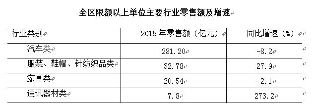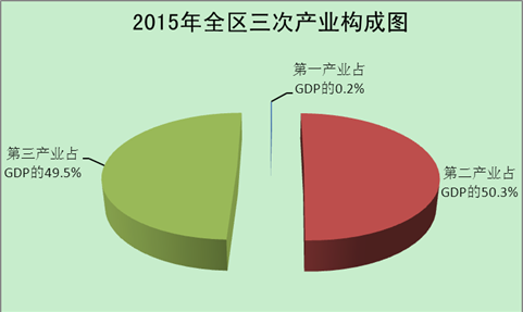 初步测算,2015年全区实现地区生产总值(GDP)725.21亿元,同比增长7.4%①。第一产业增加值1.34亿元,增长3.5%②;第二产业增加值364.81亿元,增长6.5%③;第三产业增加值359.06亿元,增长8.5 %④。全区三次产业比重为0.2:50.3:49.5。非公有制经济增加值373.02亿元,占生产总值的比重为51.4 %。2014年全区单位GDP能耗0.563吨标准煤/万元,同比下降7.6%⑤。
