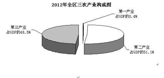 初步测算,2012年全区实现地区生产总值(GDP)516.73亿元,同比增长9.5%。其中第一产业增加值2.24亿元,增长-8.3%;第二产业增加值263.79亿元,增长7.3%;第三产业增加值250.70亿元,增长12.1%。目前全区三次产业比重为0.4:51.1:48.5。