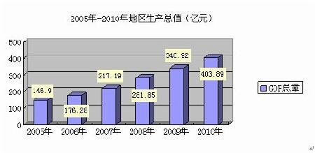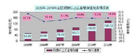 初步测算,2010年全区实现地区生产总值(GDP)403.89亿元,比上年增长15.0%。其中第一产业增加值2.48亿元,增长-3.2%;第二产业增加值218.78亿元,增长16.2%;第三产业增加值182.63亿元,增长13.9%。全区三次产业结构比例为0.6:54.2:45.2。