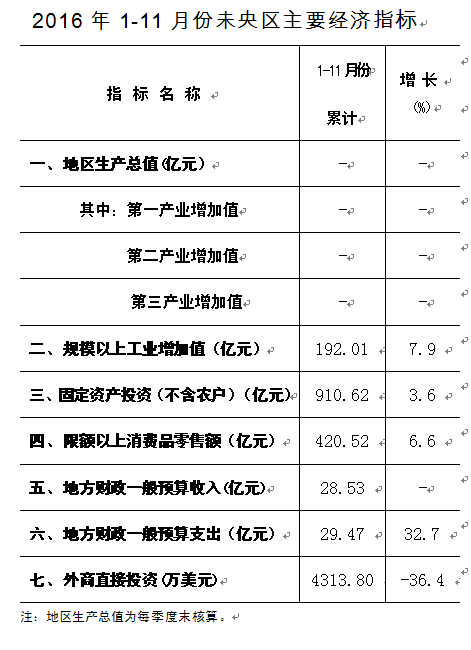 2016年1-11月份未央区主要经济指标