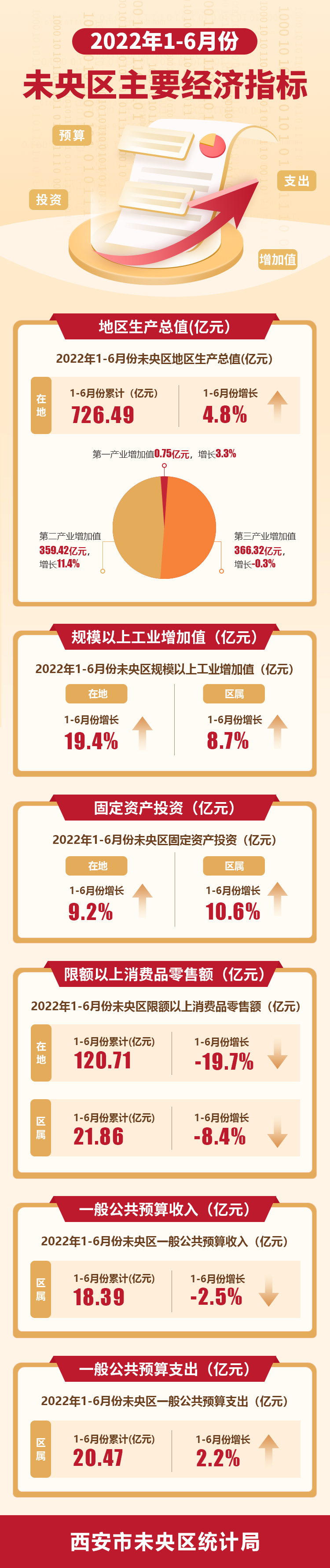 2022年1-6月份未央区主要经济指标指标名称在地区属1-6月份累计增长(%)1-6月份累计增长(%)一、地区生产总值(亿元)726.494.8--其中:第一产业增加值0.753.3--第二产业增加值359.4211.4--第三产业增加值366.32-0.3--二、规模以上工业增加值(亿元)-19.4-8.7三、固定资产投资(亿元)-9.2-10.6四、限额以上消费品零售额(亿元)120.71-19.721.86-8.4五、一般公共预算收入(亿元)--18.39-2.5一般公共预算支出(亿元)--20.472.2注:地区生产总值为每季度末核算。 |