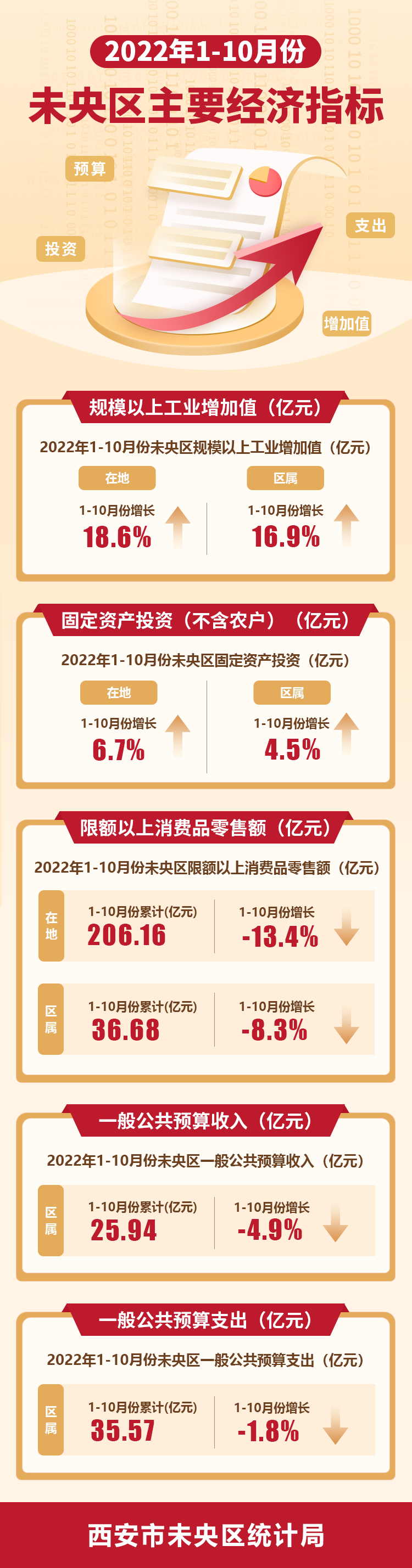 2022年1-10月份未央区主要经济指标指标名称在地区属1-10月份累计增长(%)1-10月份累计增长(%)一、地区生产总值(亿元)----其中:第一产业增加值----第二产业增加值----第三产业增加值----二、规模以上工业增加值(亿元)-18.6-16.9三、固定资产投资(不含农户)(亿元)-6.7-4.5四、限额以上消费品零售额(亿元)206.16-13.436.68-8.3五、一般公共预算收入(亿元)--25.94-4.9一般公共预算支出(亿元)--35.57-1.8注:地区生产总值为每季度末核算。 |