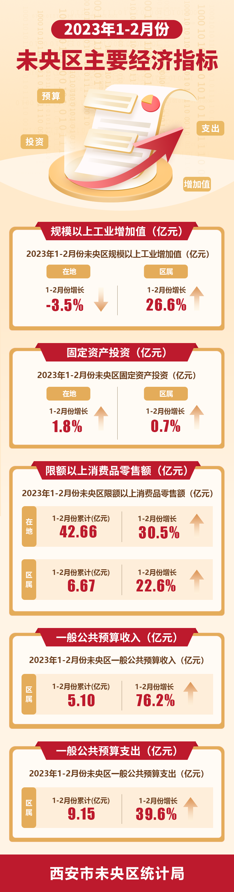 2023年1-2月份未央区主要经济指标指标名称在地区属1-2月份累计增长(%)1-2月份累计增长(%)一、地区生产总值(亿元)----其中:第一产业增加值----第二产业增加值----第三产业增加值----二、规模以上工业增加值(亿元)--3.5-26.6三、固定资产投资(不含农户)(亿元)-1.8-0.7四、限额以上消费品零售额(亿元)42.6630.56.6722.6五、一般公共预算收入(亿元)--5.1076.2一般公共预算支出(亿元)--9.1539.6注:地区生产总值为每季度末核算。 |